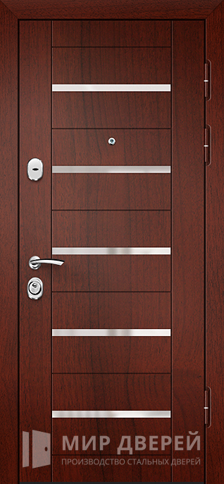 Эта модель сочетает в себе надежность металлической конструкции и привлекательный внешний вид, подходящий для установки в квартиру, офис или частный дом. Основа выполнена из профильной трубы 50х25 мм с дополнительными ребрами жесткости 40х25 мм, что придает полотну прочность и устойчивость к внешним нагрузкам. Лист металла толщиной 2 мм надежно защищает от взлома, а блокираторы повышают уровень безопасности. Отделка с обеих сторон выполнена из панелей МДФ с ПВХ-покрытием, благодаря чему поверхность устойчива к износу и легко вписывается в интерьер. Цветовые решения в коричневых, темных и венге оттенках позволяют гармонично сочетать дверь с любым стилем квартиры. Дверь входная сейфовая с шумоизоляцией в квартиру №22 дополнительно оборудована двумя контурами резинового уплотнителя, которые снижают проникновение сквозняков и посторонних звуков. При необходимости можно заказать установку минеральной плиты или пенопласта для усиленной тепло- и шумоизоляции. Такая дверь станет оптимальным выбором для тех, кто ценит безопасность, практичность и долговечность в сочетании с современным дизайном.